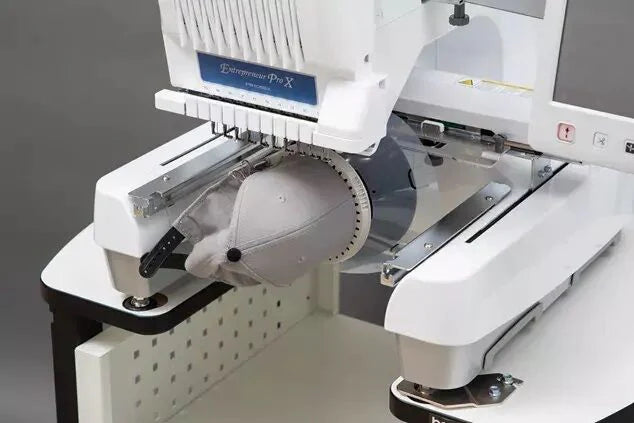 Embroider closer to the brim with easy alignment and ratcheting mechanism, simply press the upper frame to align to the center of the cap. The cap curves according to its natural curvature and allows the original shape to be retained without any distortion or scratches after removing the frame. The embroidery field is 2-3/8 " × 5-1/8 ".