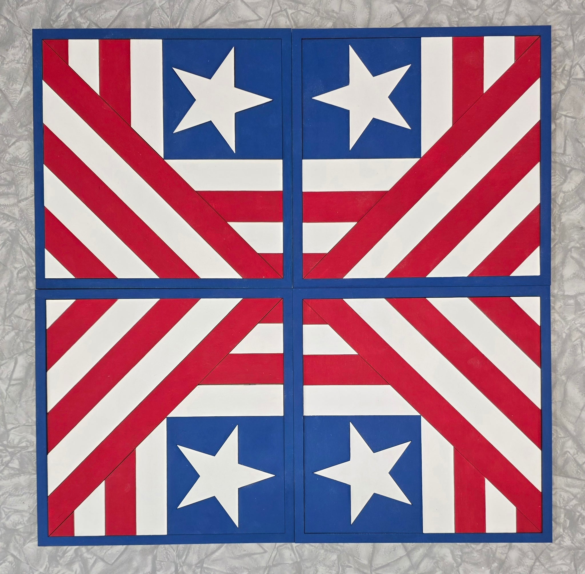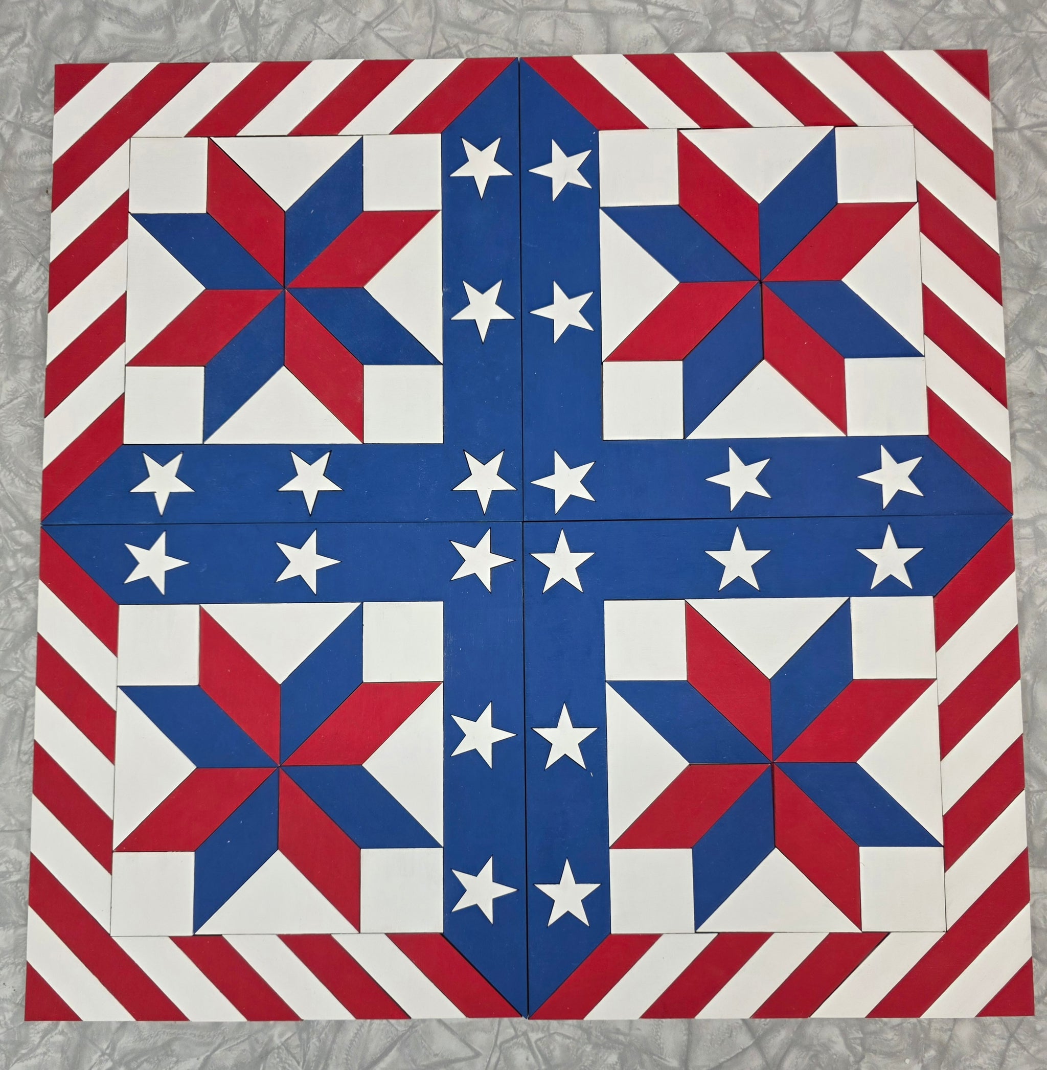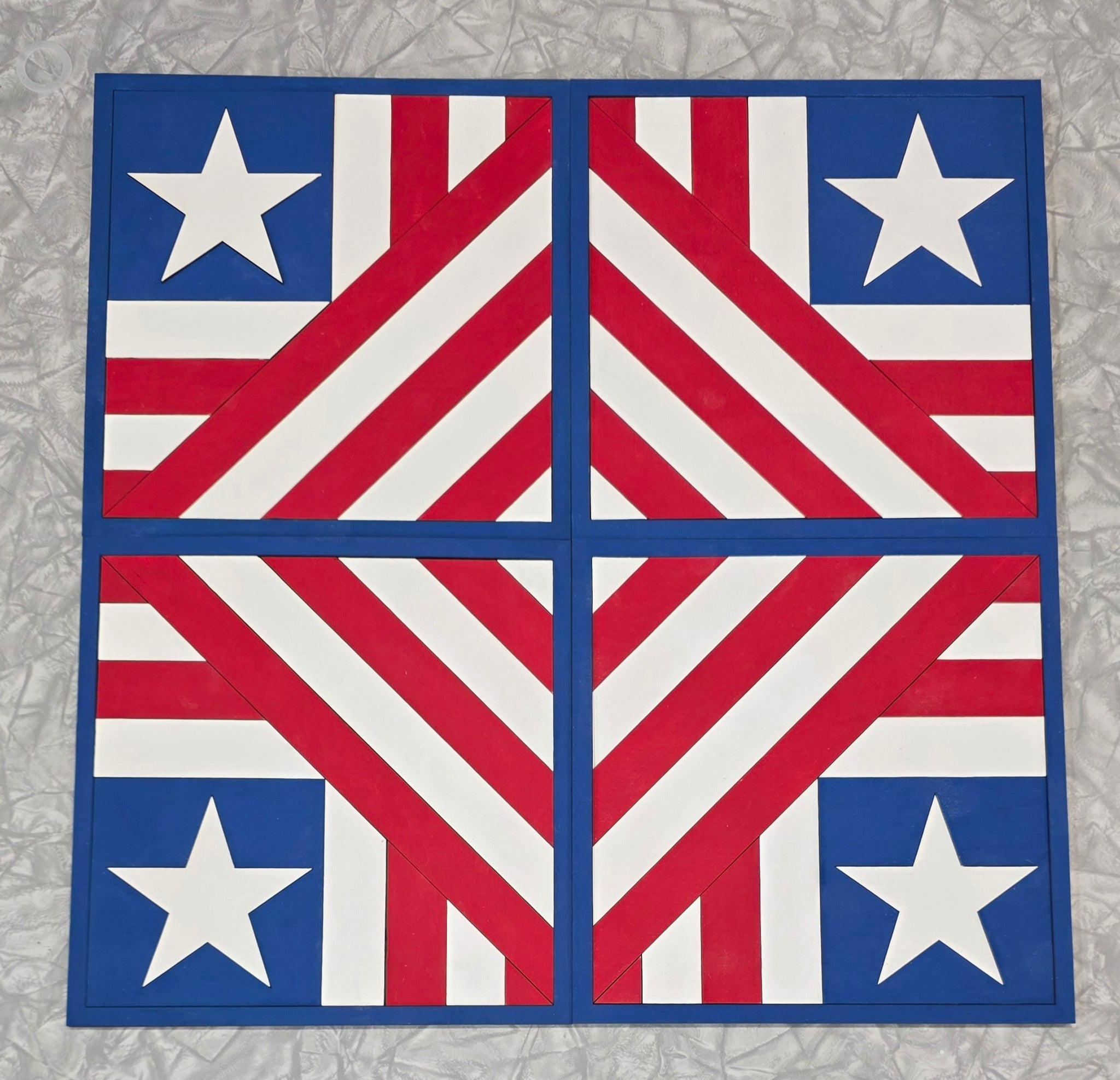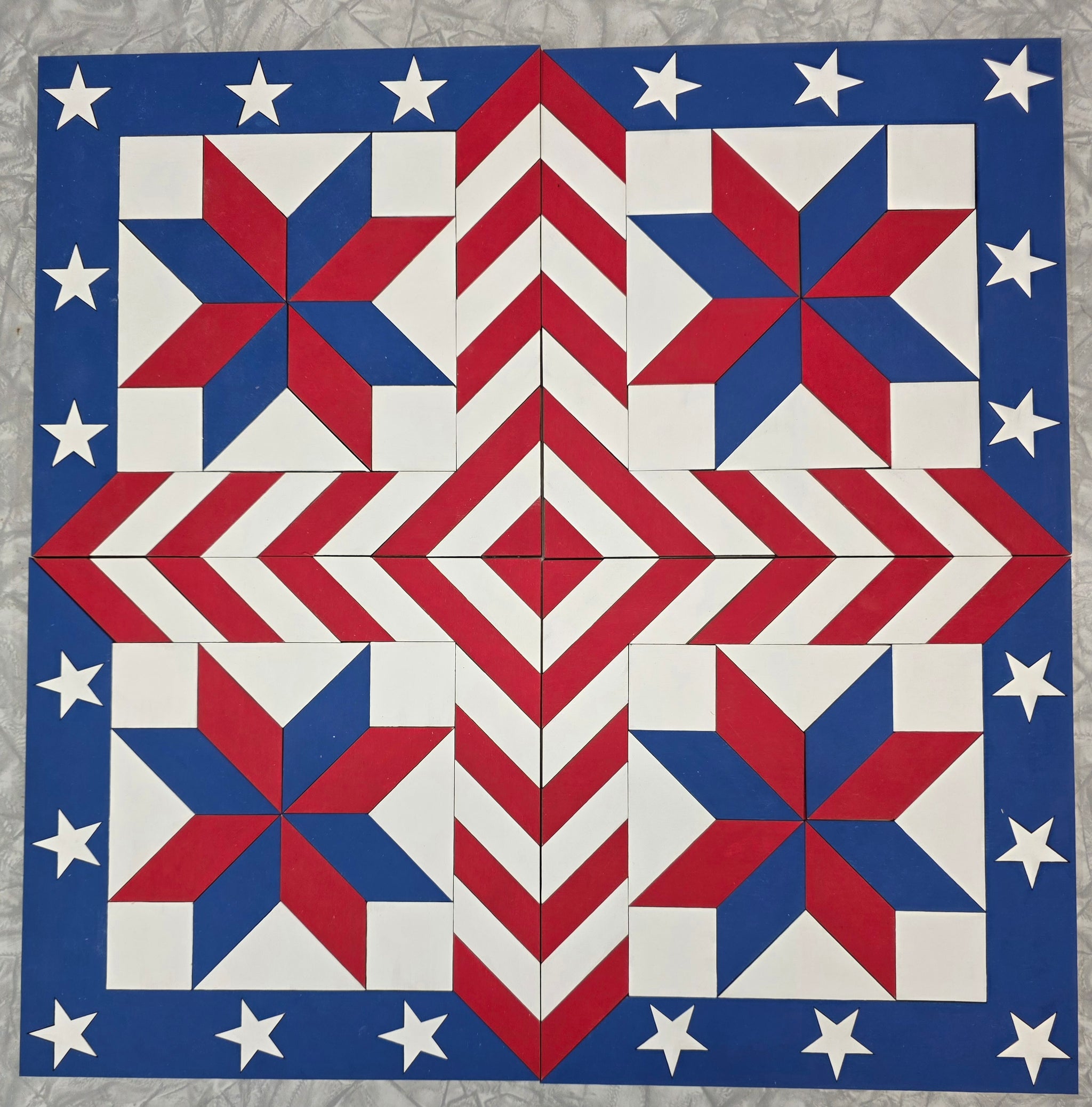 Paint a patriotic 9" × 9" wooden barn quilt block.